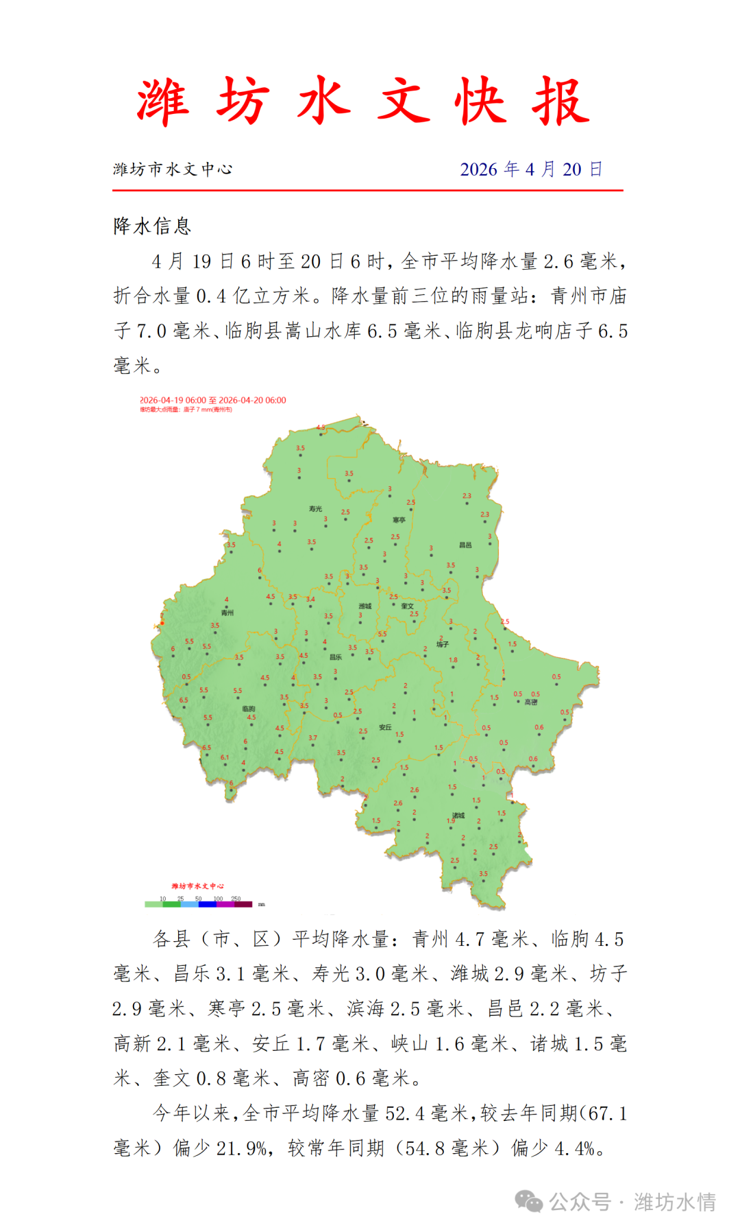 各縣(市、區(qū))平均降水量:青州4.7毫米、臨朐4.5毫米、昌樂3.1毫米、壽光3.0毫米、濰城2.9 毫米、坊子2.9 毫米、寒亭2.5毫米、濱海2.5 毫米、昌邑2.2 毫米、高新2.1毫米、安丘1.7毫米、峽山1.6 毫米、諸城1.5毫米、奎文0.8毫米、高密0.6毫米。