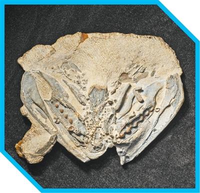鈍齒宏頜魚化石,發(fā)現(xiàn)于云南曲靖志留紀晚期(約4.23億年前)地層中,全長1米有余,是當時最大的魚類。從完整的頭顱化石中可以看到,嘴里交錯長著小帽狀的“齒墊”,上面密布小牙。