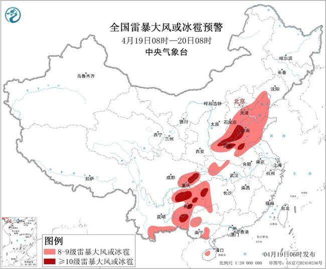 預(yù)計4月19日8時至20日8時,華北東部和南部、黃淮大部、江漢西部、西南地區(qū)東部和南部、華南西部等地的部分地區(qū)將有8級以上雷暴大風(fēng)或冰雹天氣,其中,河北南部、山東中西部、河南中北部和東部、安徽北部、湖南西部、四川盆地東南部、重慶中部、貴州中北部、廣西西部等地的部分地區(qū)將有10級以上雷暴大風(fēng),最大風(fēng)力可達(dá)11級以上;華北南部、黃淮中西部、西南地區(qū)東部和南部、華南西部等地的部分地區(qū)將有小時雨量大于20毫米的短時強(qiáng)降水天氣,其中,重慶中西部、貴州西部和北部、廣西西部和南部沿海等地的部分地區(qū)小時雨量大于50毫米,最大可達(dá)60毫米以上。